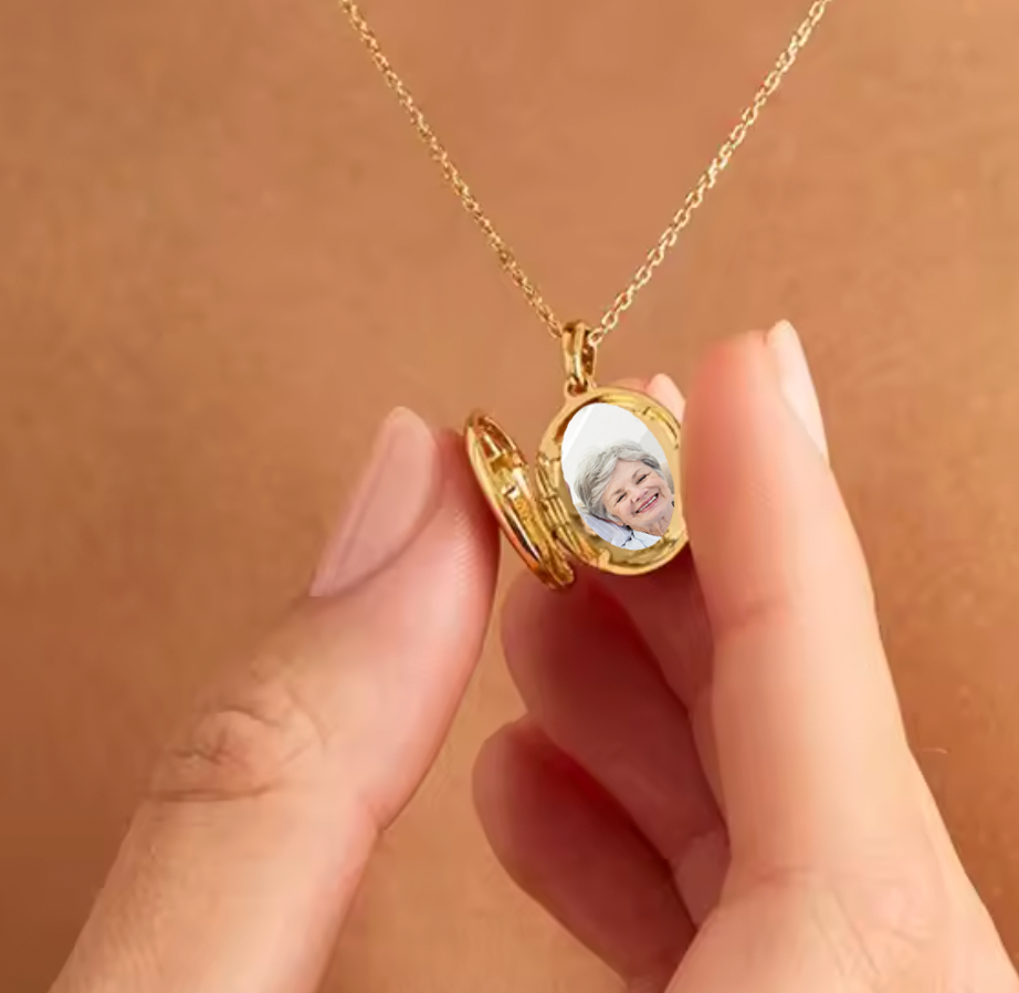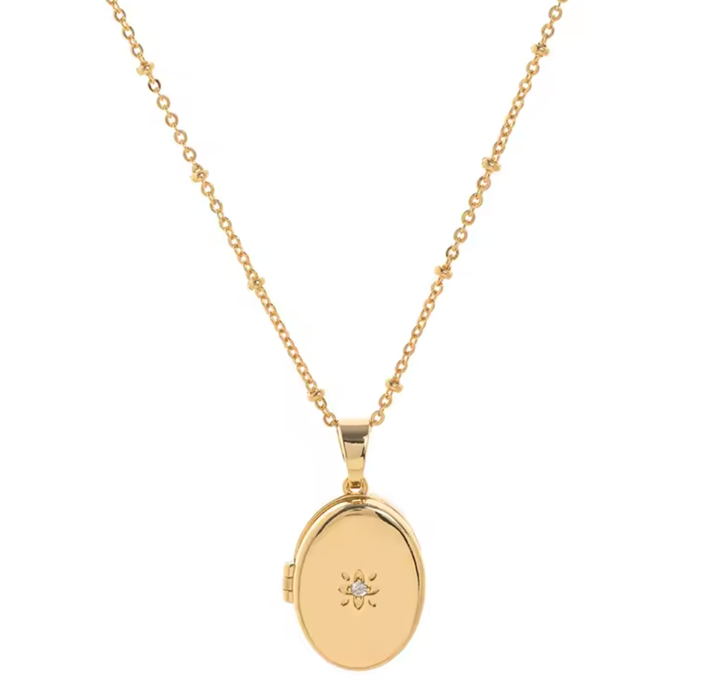 Relicario ovalado con zirconia en chapa de oro con cadena y con 1 foto personalizada.